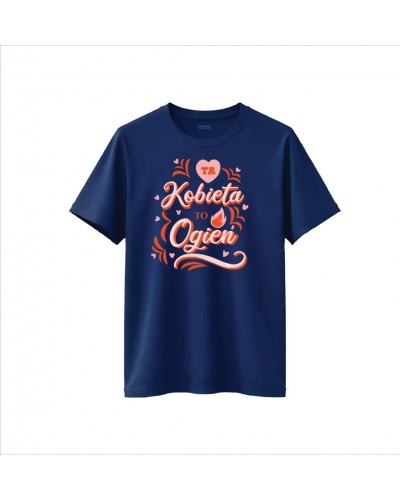 Granatowy T-shirt z napisem „Ta kobieta to ogień” i delikatnymi dekoracjami to połączenie kobiecości i wyrazistego charakteru. Wykonany z miękkiej, wysokiej jakości bawełny, zapewnia komfort noszenia przez cały dzień, a klasyczny krój pasuje do każdej sylwetki.