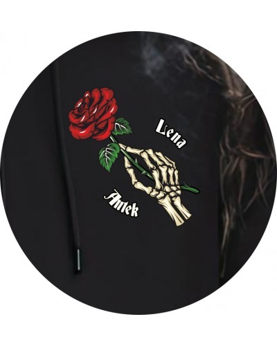 Na plecach bluz znajduje się efektowna grafika: czule obejmujące się kościotrupy, symbolizujące wieczną miłość, której nie pokona nawet śmierć. Między nimi widnieje pełna, rozkwitnięta róża — znak namiętności i oddania — a całość dopełniają inicjały pary, nadając projektowi osobisty, unikalny charakter.
